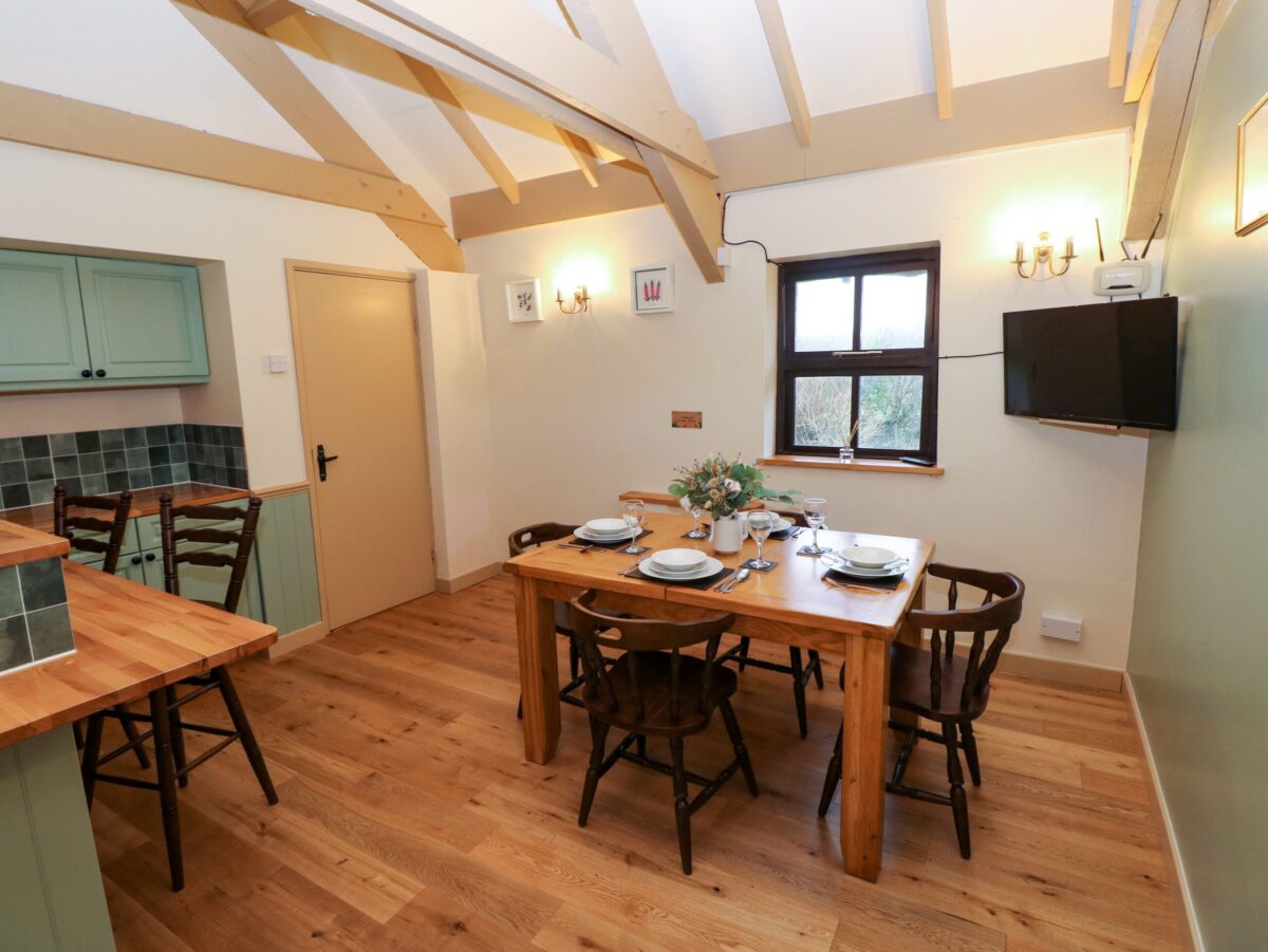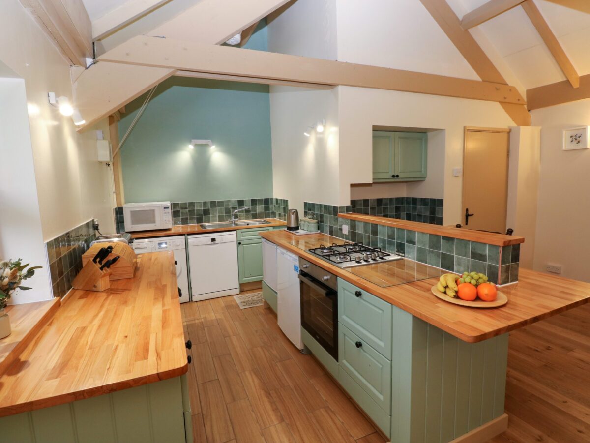 The kitchen and dining room – The kitchen and dining room is 5.1m x 5.9m (max) and was completely redesigned and refurbished in Jan 25. The kitchen boasts an electric oven and gas hob, a fridge and an additional freezer, microwave, dishwasher, washing machine and plentiful cupboard space. It is fully stocked with a range of utensils, cutlery and crockery. The extensive beech wood surfaces in the kitchen perfectly complement to country cottage theme.