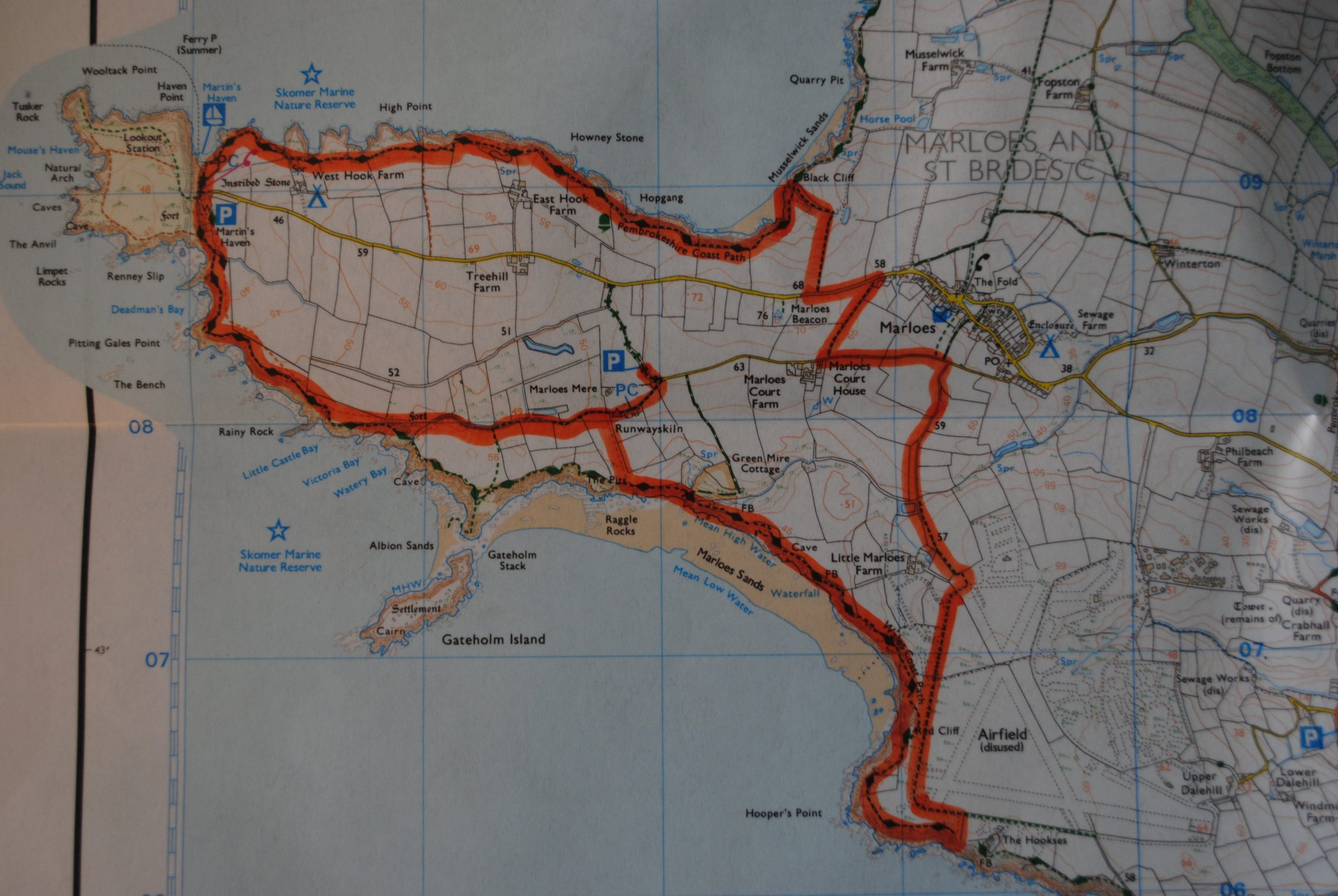 Suitable Location My meeting was in Pembroke Dock and so it made sense to look in that general area. Using the 1:25,000 scale OS map we scanned the coastline and saw various options for coastline nearby. But our eyes soon settled on the Marloes Peninsula and Martin’s Haven (above) in particular because we had enjoyed a really fantastic evening there in the Spring watching the sun set over Skomer Island and Jack Sound and we had promised ourselves that we would walk the whole peninsula one day: location sorted!! Using my fingers I ‘walked round an approximate route – about 10 km and at 3km/hr plus stops we probably needed about 5 hours. Martin Haven from Pembroke is no more than one hour so 11:00 (meeting finished) plus 1hr travel and 5hrs walking = we should be safely back at the car about 17:00. Perfect timing for a short drive to the pub in Marloes for something to eat and then another hour to home and Emmerdale!!